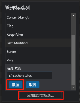 3. 在弹窗中单击“添加自定义标头”,输入“cf-cache-status ”,然后点击“添加”,添加后按Esc退出管理标头列弹窗;