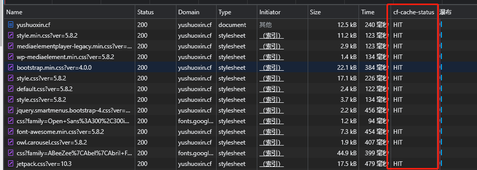 此时,你就会看到开发者工具中多了一列 cf-cache-status,然后你就可以直观的看到各个元素在Cloudflare中的缓存情况了。