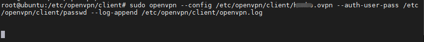 sudo openvpn --config /etc/openvpn/client/XXXX.ovpn --auth-user-pass /etc/openvpn/client/passwd --log-append /etc/openvpn/client/openvpn.log