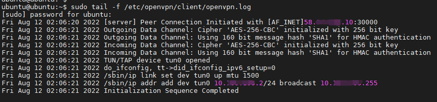 根据我们执行的指令,openVPN的连接日志log会保存在/etc/openvpn/client/openvpn.log中,类似下图