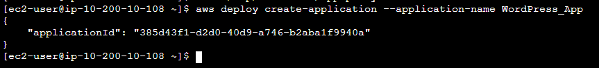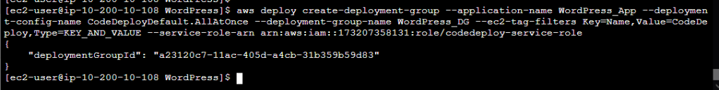 aws deploy create-deployment-group --application-name WordPress_App --deployment-config-name CodeDeployDefault.AllAtOnce --deployment-group-name WordPress_DG --ec2-tag-filters Key=Name,Value=CodeDeploy,Type=KEY_AND_VALUE --service-role-arn arn:aws:iam::173207358131:role/codedeploy-service-role
