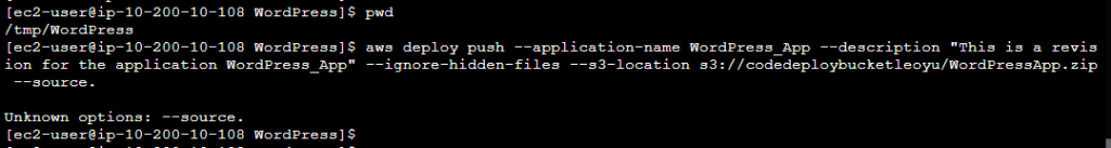 aws deploy push --application-name WordPress_App --description "This is a revision for the application WordPress_App" --ignore-hidden-files --s3-location s3://codedeploybucketleoyu/WordPressApp.zip --source.