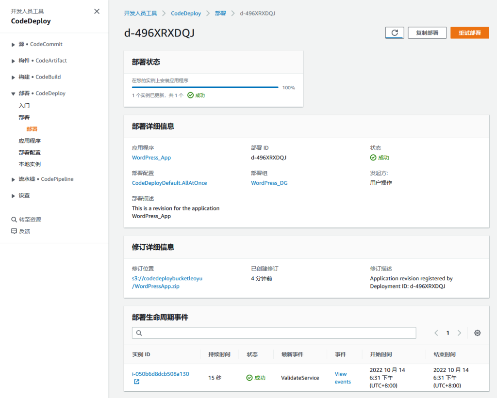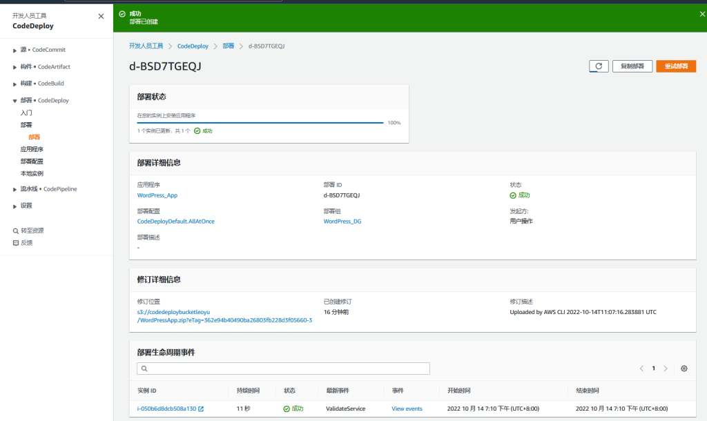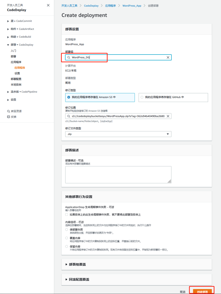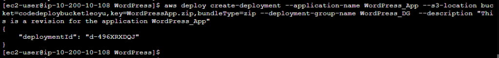 aws deploy create-deployment --application-name WordPress_App --s3-location bucket=codedeploybucketleoyu,key=WordPressApp.zip,bundleType=zip --deployment-group-name WordPress_DG --description "This is a revision for the application WordPress_App"