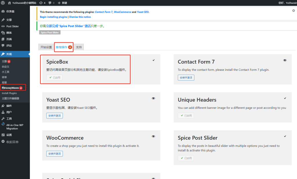 这时,需要到这个主题下,把SpiceBox启用,然后主页就可以看到之前的大图片了。
