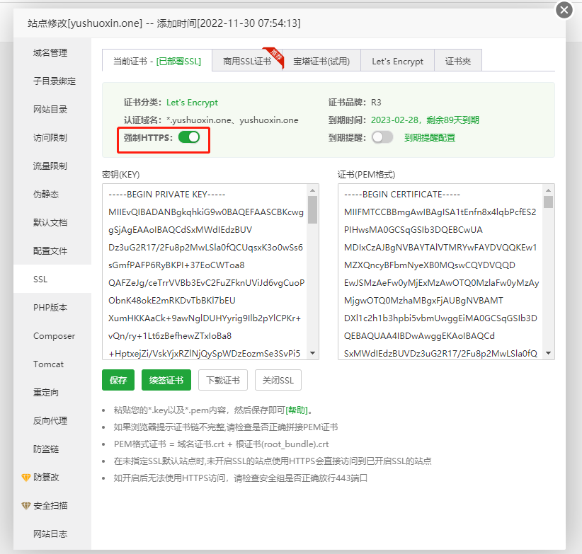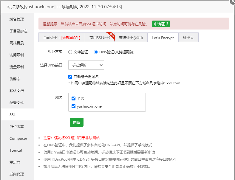 这里宝塔证书和Let’s Encrypt其实申请其中一个就行,宝塔证书是一年有效期,另一个是几个月,但是可以自动续期。