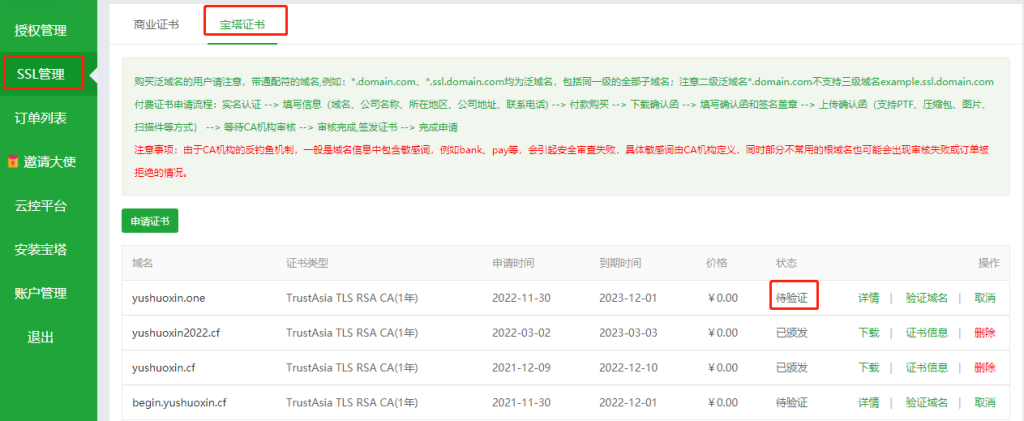 申请后,可以到宝塔官网https://www.bt.cn/admin/safe 检查宝塔证书的申请状态,我这次是过了不到6个小时,由待验证变成已颁发的。
