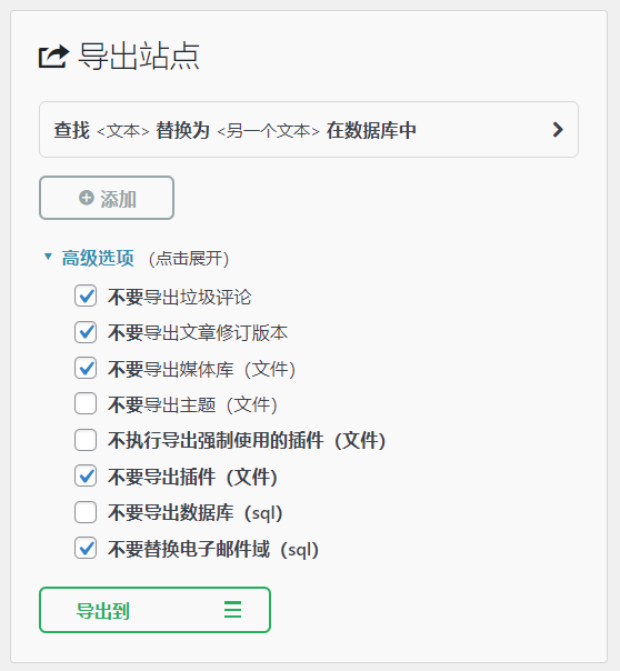 现在用它导出备份,因为免费版最大只能恢复50MB大小的备份文件,因此我这里选择只备份:数据库+主题+强制使用的插件。