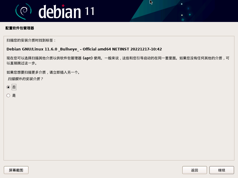 咱装的是Debian11.6,选项里没有,这里先选10.X,顺利的话不会是问题。