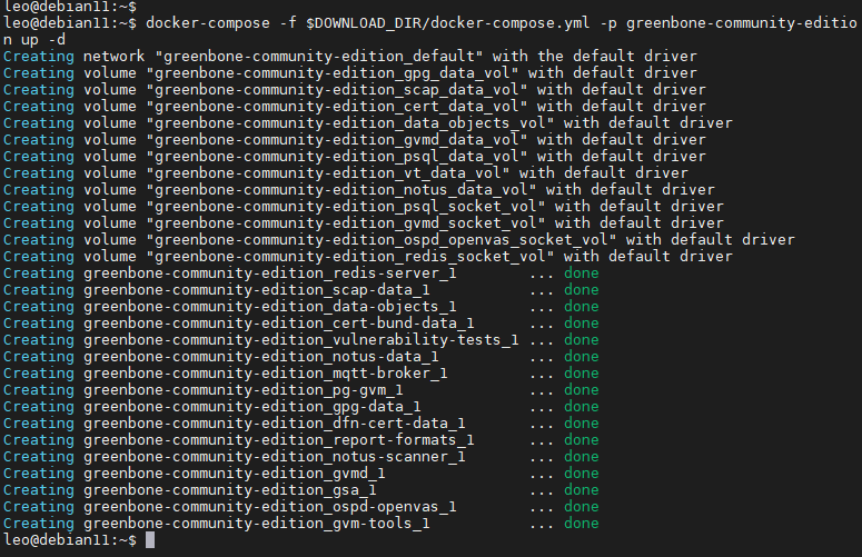 docker-compose -f $DOWNLOAD_DIR/docker-compose.yml -p greenbone-community-edition up -d