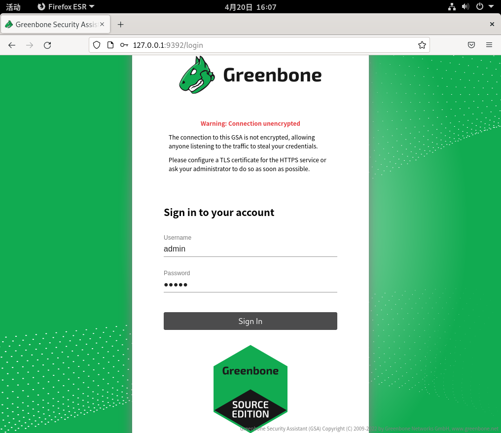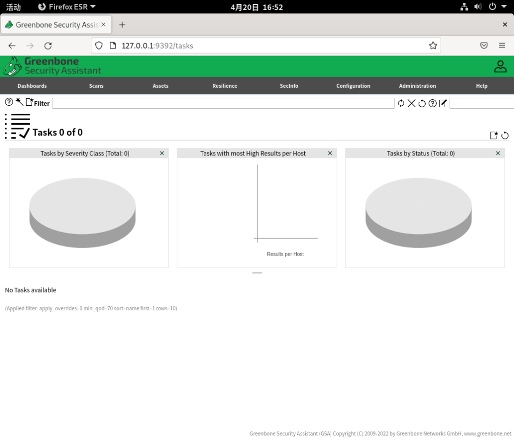 昨天在VMware中直接shutdown了Debian系统,今天重新启动Debian进入Greenbone再试下~