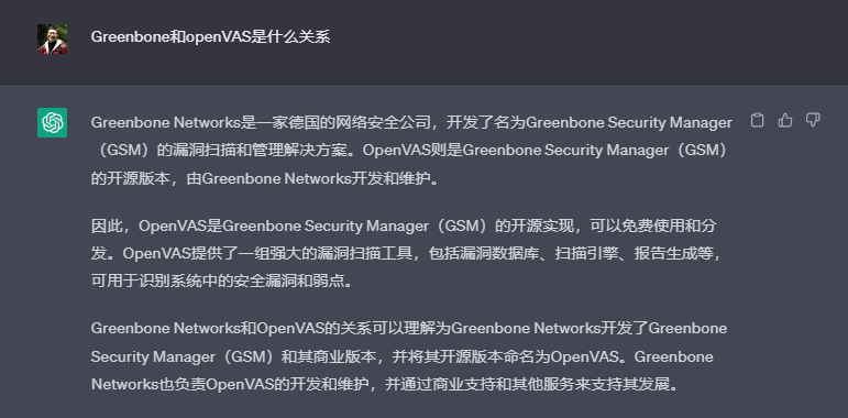 这里需要补充下Greenbone和openVAS的关系,我们请聪明的chatGPT为我们解答下。