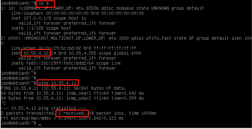 ip a可见虚机1的IP确实变成想要的10.55.4.12了。而且ping虚机1也可ping通。