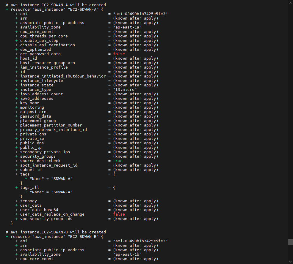 环境变量中的vpcid 是已经创建好的VPC的ID;host1eni是SDWAN-A实例的网络接口ENI的ID,可通过terraform自动获取变量;host2eni与host1eni同理。