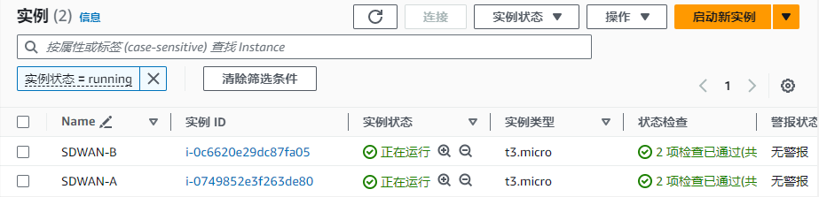 完成配置后,可登陆AWS控制台,查看两个SDWAN实例已创建,如下图。