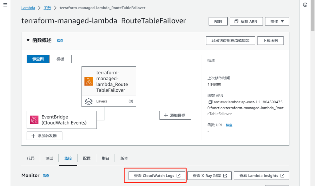 还可到lambda页面的监控页中,点击“查看CloudWatch Logs”,查看相关log。