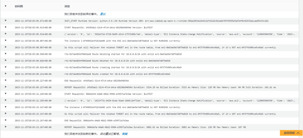 根据我们设计的功能,当SDWAN-A实例状态不为running时,CloudWatch的EventBridge会触发lambda,查找路由表中下一跳网关为SDWAN-A的相关路由,并把这些下一跳网关改为SDWAN-B。